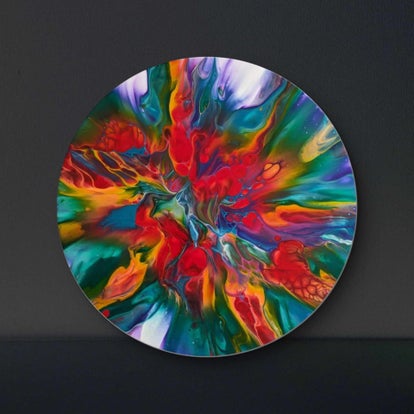 Ajoutez une explosion de couleur à votre intérieur avec notre tableau rond 'Éclat de Joie'. Réalisé en coton de 380 g/m² avec des peintures acryliques fines, cette toile d'art fluide est dotée d'une finition vitrifiée pour une brillance durable.
